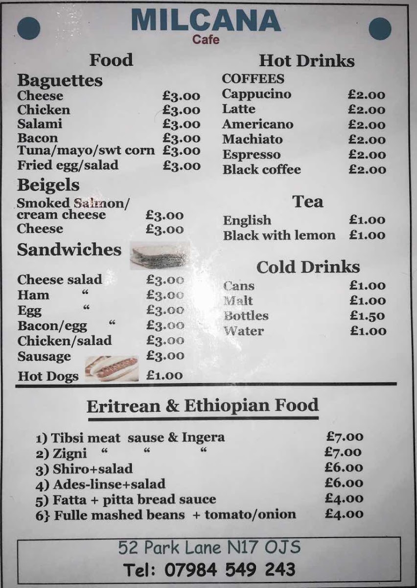 From a reviewer's perspective, Milcana Ethiopian & Eritrean Cafe at 52 Park Ln impresses with a menu that blends familiar café staples with authentic East African flavors. For lighter bites, their Baguettes-offering Cheese, Chicken, Salami & Bacon, Tuna/Mayo, and Sweet Corn-and Sandwiches such as Cheese Salad, Ham, Egg & Sausage, and Hot Dogs provide straightforward, satisfying options. Coffee lovers are well catered for with a selection including Americano, Macchiato, Espresso, Black Coffee, and English Tea, alongside specialty drinks like Cappuccino and Latte. Cold beverages are plentiful, featuring Cans, Malt, Bottles, and Water to complement any meal. The highlight, however, is the authentic Eritrean and Ethiopian cuisine, with signature dishes like Tibsi Meat Sauce & Ingera, Zigni, Shiro + Salad, Ades-Linse + Salad, and Fatta + Pitta Bread Sauce, which bring rich, flavorful, and traditional tastes to the table. Overall, the menu strikes a balance between approachable café favorites and the unique, hearty flavors of East Africa, making it a versatile spot for both casual bites and culturally immersive meals.